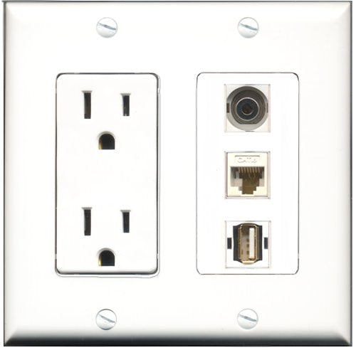RiteAV - 15 Amp Power Outlet 1 Port USB A-A 1 Port 3.5mm 1 Port Cat6 Ethernet Ethernet White Decorative Wall Plate