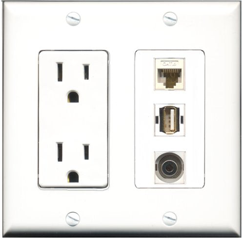 RiteAV - 15 Amp Power Outlet 1 Port USB A-A 1 Port 3.5mm 1 Port Cat6 Ethernet Ethernet White Decorative Wall Plate