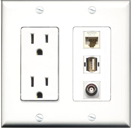 RiteAV - 15 Amp Power Outlet 1 Port USB A-A 1 Port BNC 1 Port Cat6 Ethernet Ethernet White Decorative Wall Plate