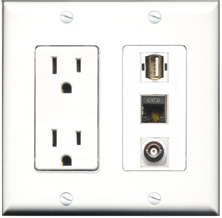 RiteAV - 15 Amp Power Outlet 1 Port USB A-A 1 Port Shielded Cat6 Ethernet Ethernet 1 Port BNC Decorative Wall Plate