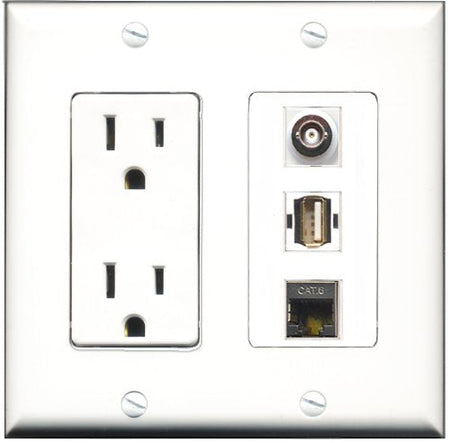 RiteAV - 15 Amp Power Outlet 1 Port USB A-A 1 Port Shielded Cat6 Ethernet Ethernet 1 Port BNC Decorative Wall Plate