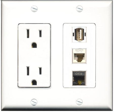 RiteAV - 15 Amp Power Outlet 1 Port USB A-A 1 Port Shielded Cat6 Ethernet Ethernet 1 Port Cat6 Ethernet Ethernet White Decorative Wall Plate