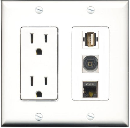 RiteAV - 15 Amp Power Outlet 1 Port USB A-A 1 Port Shielded Cat6 Ethernet Ethernet 1 Port Toslink Decorative Wall Plate