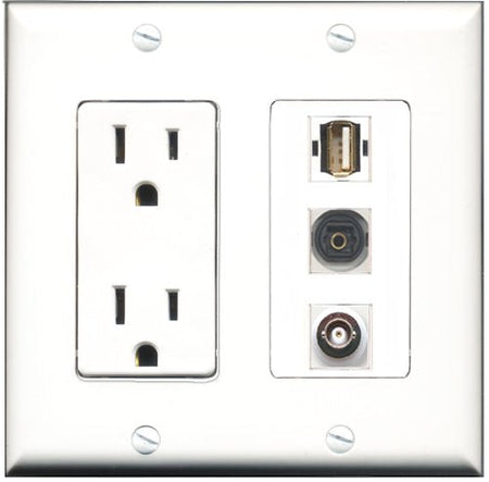 RiteAV - 15 Amp Power Outlet 1 Port USB A-A 1 Port Toslink 1 Port BNC Decorative Wall Plate
