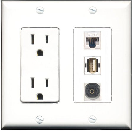 RiteAV - 15 Amp Power Outlet 1 Port USB A-A 1 Port Toslink 1 Port Cat5e Ethernet White Decorative Wall Plate