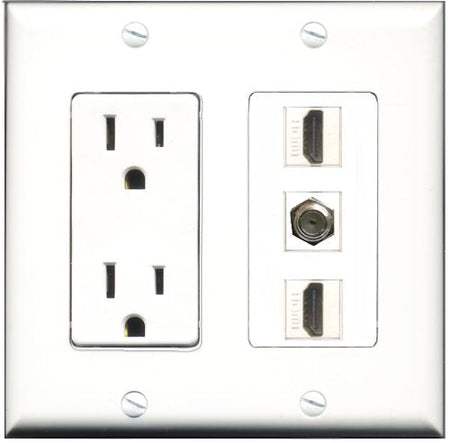 Please note: It is required to install this item in a divided outlet box. Recommended compatible outlet boxes Carlon BH234R (Old work). This is a 2 Piece Decorative Wall Plate (plate and plate cover). Tooless connection, Just plug one cable into the front and one into the back. Outlet needs to be hard wired as a regular outlet. High quality, screws included. Fits standard outlet boxes, decora(tive) plates and mounting brackets. Female on both sides of the plate jacks for easy plugin. 4 inch distance between screws. This is not a GFCI outlet and is not to be installed near or behind a kitchen sink, bathtub, bathroom or within 12-15 feet of any source of water. Must be installed into a new or existing plastic or metal outlet electrical box for safety. Do not install this with a drywall only mounting bracket.