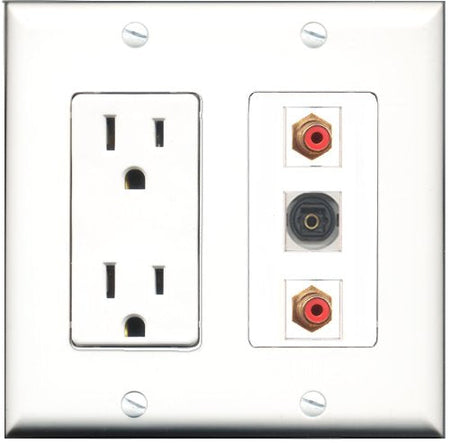 Please note: It is required to install this item in a divided outlet box. Recommended compatible outlet boxes Carlon BH234R (Old work). This is a 2 Piece Decorative Wall Plate (plate and plate cover). Tooless connection, Just plug one cable into the front and one into the back. Outlet needs to be hard wired as a regular outlet. High quality, screws included. Fits standard outlet boxes, decora(tive) plates and mounting brackets. Female on both sides of the plate jacks for easy plugin. 4 inch distance between screws. This is not a GFCI outlet and is not to be installed near or behind a kitchen sink, bathtub, bathroom or within 12-15 feet of any source of water. Must be installed into a new or existing plastic or metal outlet electrical box for safety. Do not install this with a drywall only mounting bracket.