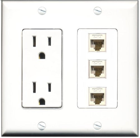 RiteAV - 15 Amp Power Outlet 3 Port Cat6 Ethernet Ethernet White Decorative Wall Plate