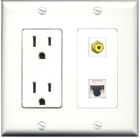 Please note: It is required to install this item in a divided outlet box. Recommended compatible outlet boxes Carlon BH234R (Old work). This is a 2 Piece Decorative Wall Plate (plate and plate cover). Tooless connection, Just plug one cable into the front and one into the back. Outlet needs to be hard wired as a regular outlet. High quality, screws included. Fits standard outlet boxes, decora(tive) plates and mounting brackets. Female on both sides of the plate jacks for easy plugin. 4 inch distance between screws. This is not a GFCI outlet and is not to be installed near or behind a kitchen sink, bathtub, bathroom or within 12-15 feet of any source of water. Must be installed into a new or existing plastic or metal outlet electrical box for safety. Do not install this with a drywall only mounting bracket.