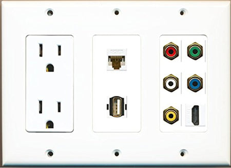RiteAV 15A 125V Power Outlet HDMI Cat6 Component Video RCA USB Wall Plate 3 Gang