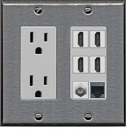 RiteAV 15A Power Outlet, 4 HDMI, 1 Cat5e Ethernet, 1 Coax Cable TV Wall Plate - Stainless/Gray