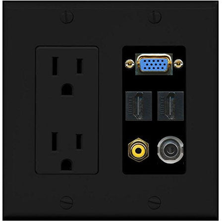 RiteAV (2 Gang) 15A Power Outlet Svga RCA Yellow 3.5mm 2 HDMI Wall Plate Black