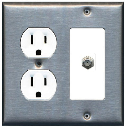 RiteAV (2 Gang Decorative) 15 Amp Round Power Outlet Coax Cable TV Wall Plate - Stainless Steel/White