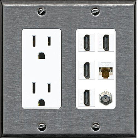 RiteAV - (2 Gang Decorative) 15A Outlet 4 HDMI Coax Cat6 Wall Plate Stainless Steel White