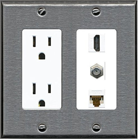 RiteAV - (2 Gang Decorative) 15A Outlet HDMI Coax Cat6 Wall Plate Stainless Steel White