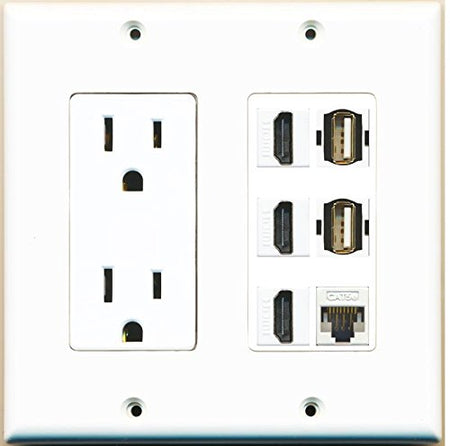 RiteAV - (2 Gang Decorative) 15A Power Outlet 3 HDMI Cat5e White 2 USB A-A Wall Plate White