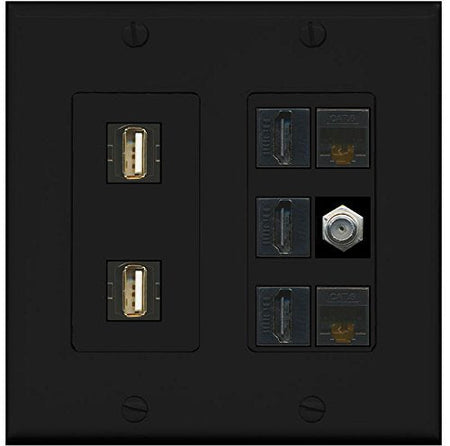 RiteAV - (2 Gang Decorative) 2 USB 3 HDMI Coax 2 Cat6 Wall Plate Black