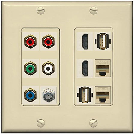 RiteAV (2 Gang Decorative) Component RGB 2 USB HDMI Cat6 Coax Wall Plate Ivory