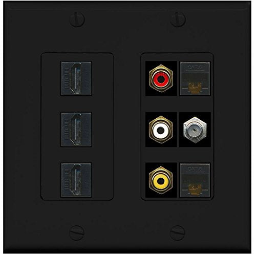 RiteAV - (2 Gang Decorative) Composite Video 3 HDMI Coax 2 Cat6 Black Wall Plate Black