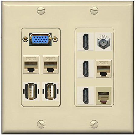 RiteAV (2 Gang) Svga 2 USB A-A 3 HDMI Coax 3 Cat6 Phone Wall Plate Ivory