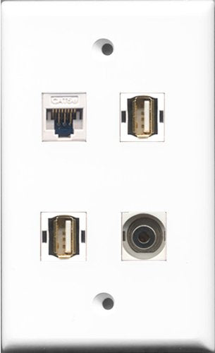 RiteAV - 2 Port USB A-A and 1 Port 3.5mm and 1 Port Cat5e Ethernet White Wall Plate