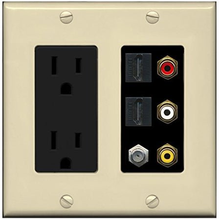RiteAV - 2 x 15 Amp 125V Power Outlet 3 x RCA - 2 X HDMI and 1 x Coax Cable TV Port Wall Plate - Ivory/Black