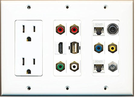 RiteAV (3 Gang) 15A Outlet HDMI Coax 2 Cat5e Component RCA Yellow 3.5mm USB Wall Plate