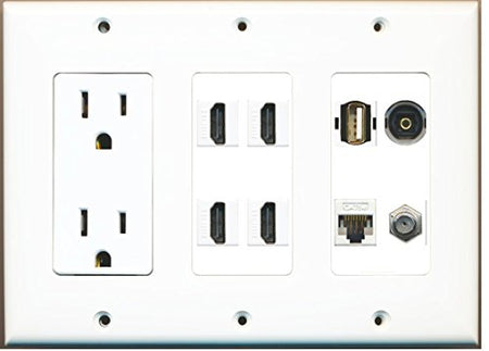 RiteAV (3 Gang) 15A Power Outlet 4 HDMI Coax Cat5e Toslink USB A-A Wall Plate White