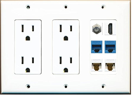 RiteAV - (3 Gang) 2 15A Power Outlet HDMI Coax 2 Cat6 White 2 Cat6 Blue Wall Plate White