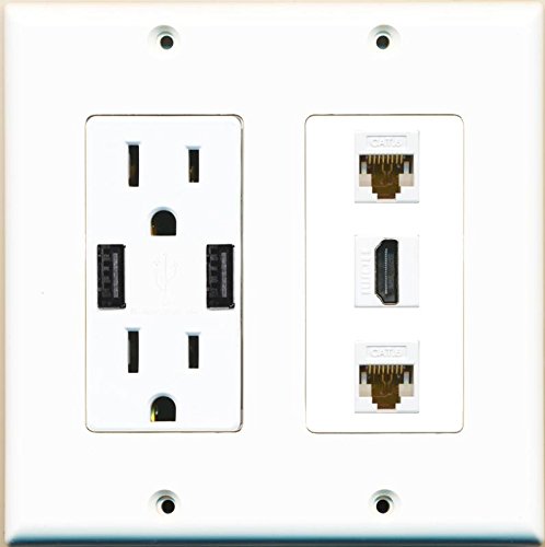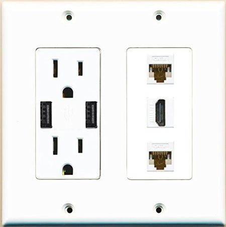 RiteAV Power Outlet 2 USB Charger HDMI White 2 Cat6 Wall Plate White