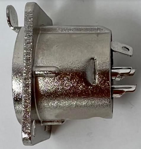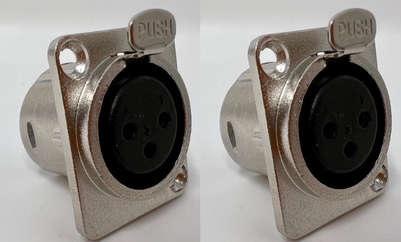 This particular D Series Coupler has silver metal housing (alternate colors are available) and accepts a terminated XLR 3 Pole Male Cable on the front side and solder cup contact termination on the backside. The 3 contacts along with the ground/shield tab must be soldered on the backside of the coupler. The inputs on the front side are expertly crafted to ensure that 3 Pole XLR Male Cables fit securely into place and can be disconnected using the integrated push lock release mechanism.
